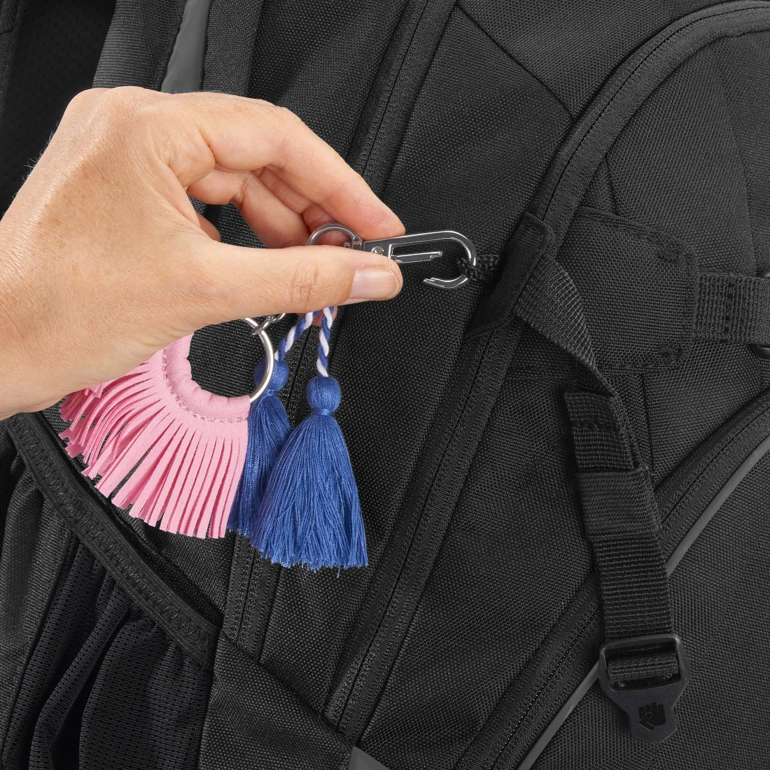 - Rucksack-Anhänger mit rosa Fransen sowie blauen Quasten