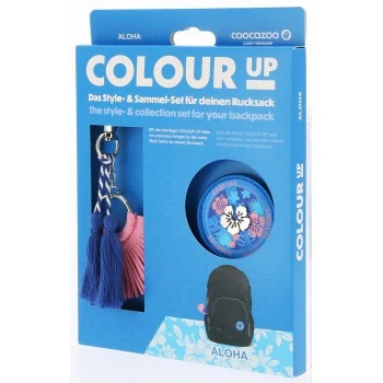 Mit dem farbenfrohen Klett-Patch Aloha wird jeder Rucksack zum Eyecatcher. Blumenliebhaber:innen und Weltenbummler:innen pimpen damit nach Lust und Laune den Schulrucksack auf. Das blumige Patch-Design in Blau-Rosa-Tönen wird durch eine Metall-Hibiscus-Blüte zum besonderen Hingucker. Zusätzlich zum Aloha-Patch enthält das COLOUR UP-Set einen mehrteiligen Anhänger, bestehend aus 2 blauen Quasten mit blau-weißer Kordel sowie einem rosafarbenen Fransen-Anhänger. So ist das Hawaii-Feeling perfekt!